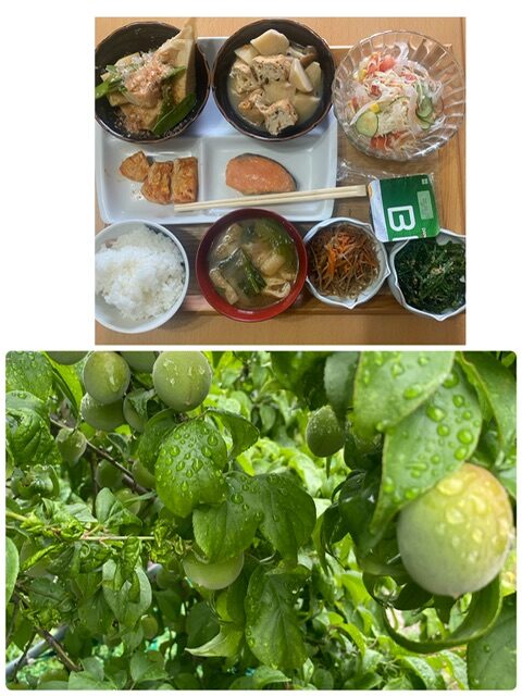 小山市産後ケア 今日のお昼のメニュー 筍の土佐煮、里芋とがんもどきの煮物、鶏胸肉焼き 鮭焼き、きんぴら、ほうれん草の胡麻和え 新玉ねぎのサラダ、ご飯と味噌汁